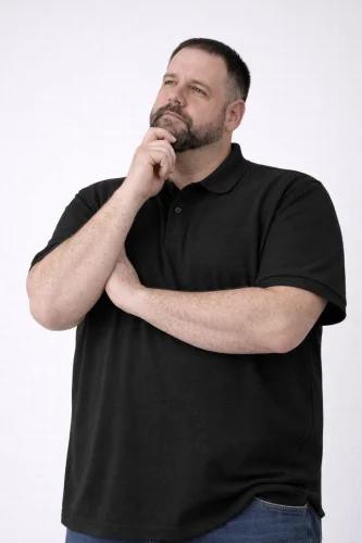 • Męska koszulka z krótkim rękawem i kołnierzykiem zapinanym na guziki, wykonana z materiału piqué, w dużym rozmiarze – czarna