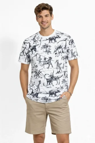 Męska biała koszulka z nadrukiem dinozaura – regularny krój, okrągły dekolt, bawełniana koszulka z nadrukiem cyfrowym – biała