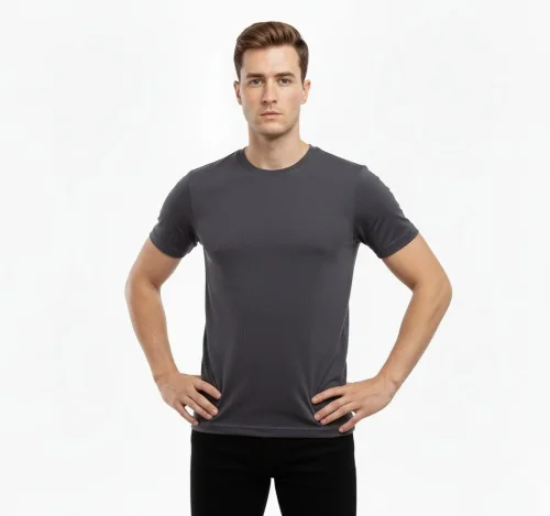 • Męska koszulka z okrągłym dekoltem, dopasowany krój, wąski krój, z lycry, body casual basic – ciemnoszary