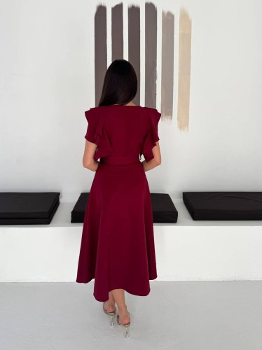 • Damska sukienka midi z okrągłym dekoltem, bufiastymi rękawami i paskiem w komplecie, podwójny materiał.