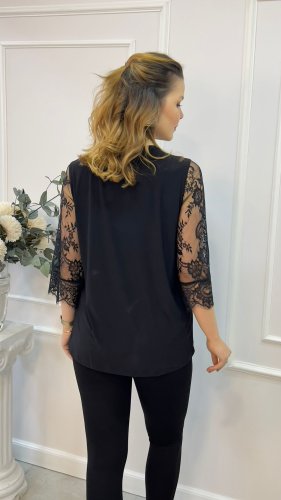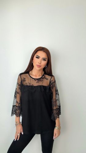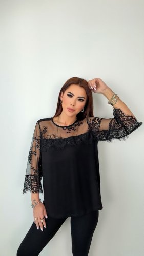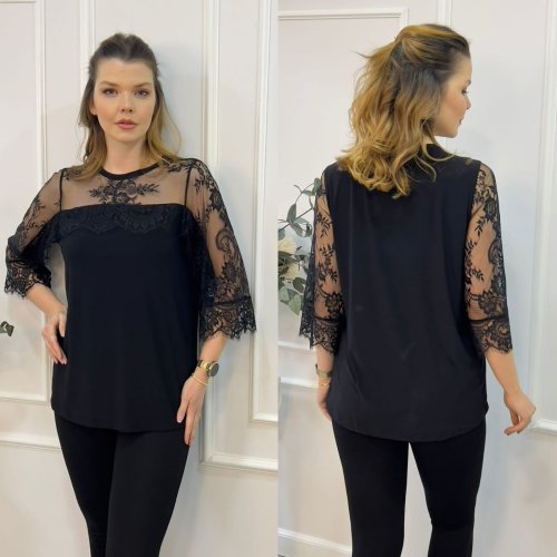 Bluzka damska z okrągłym dekoltem, z koronkowymi, prześwitującymi detalami, wykonana z tkaniny wiskozowej.