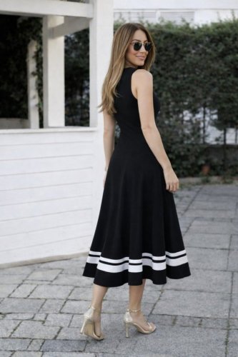 • Damska sukienka wiskozowa bez rękawów, z okrągłym dekoltem i ozdobnymi wstążkami u dołu.