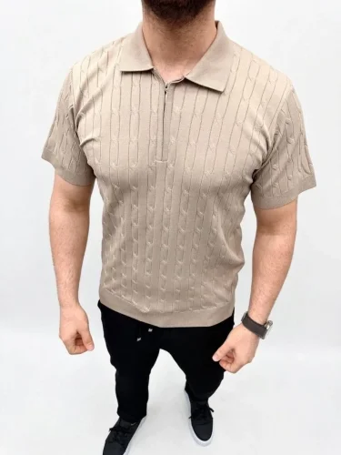 Męska letnia koszulka z dzianiny warkoczowej, z krótkim rękawem i kołnierzykiem polo, zapinana na suwak – beżowa