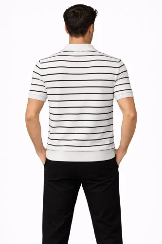 • Męska dzianinowa koszulka polo w paski, zapinana na zamek, stylowa na lato – biała