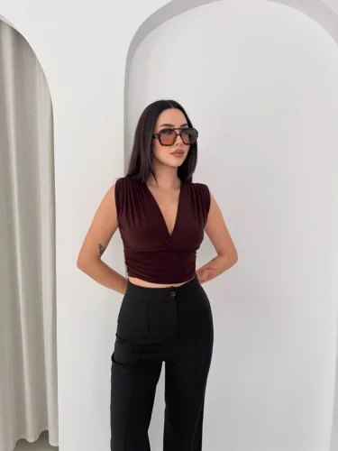 • Bluzka bez rękawów, dekolt w serek, drapowana, krótka, z poduszkami na ramionach, z lycry, dopasowana – brązowa