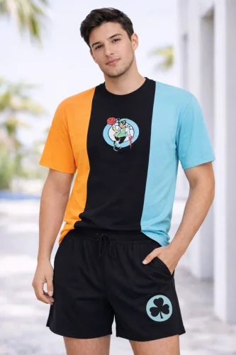• Dwuczęściowy męski komplet: koszulka z haftem i spodenki, oversize'owy strój letni – wielokolorowy