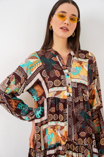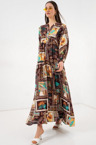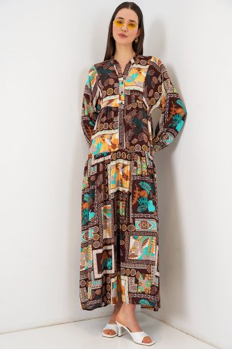• Wzorzysta długa sukienka hidżabowa 2585 - Ciemnobrązowa