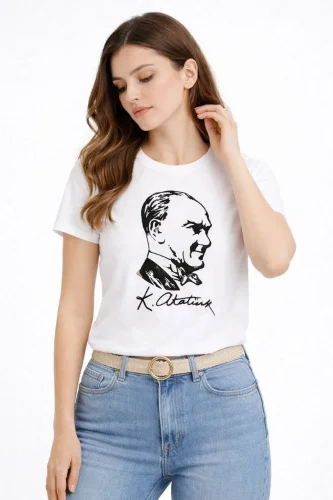 • Koszulka z nadrukiem Atatürka, koszulka z krótkim rękawem i okrągłym dekoltem – biała