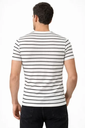 Męski T-shirt w paski, letni, dzianinowy, dopasowany, wąski, z okrągłym dekoltem, biały