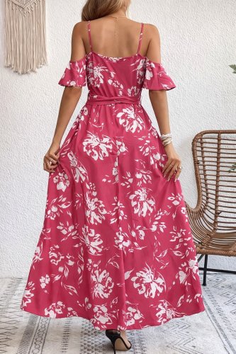 Damska sukienka na ramiączkach typu spaghetti, z krótkim rękawem, dekoltem kopertowym, rozcięciem, wzorzysta