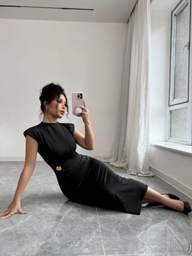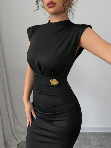 • Damska sukienka midi typu scuba z półgolfem, krótkim rękawem i kwiatowym dodatkiem