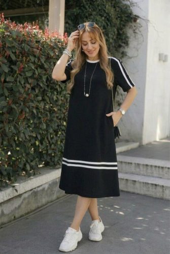 • Damska sukienka midi z wiskozy z krótkim rękawem, okrągłym dekoltem i pasiastymi detalami